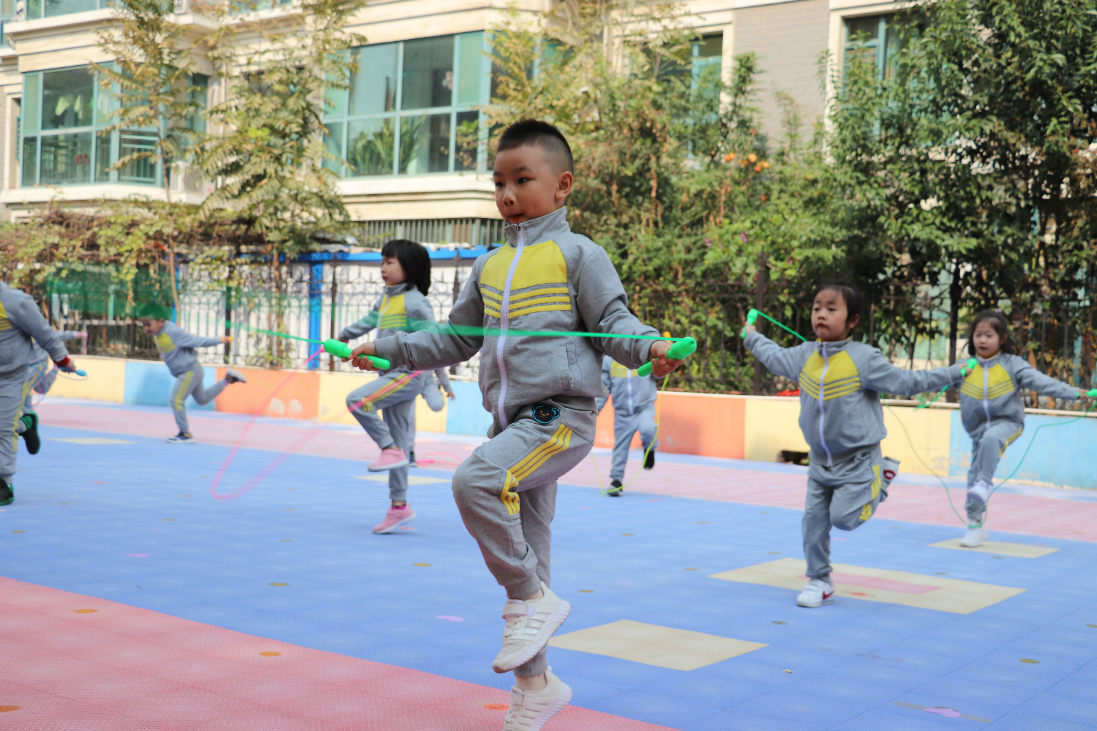 跳绳,可以增强孩子的腿部力量,可以增强孩子全身的协调性,有利于孩子的健康成长,促进孩子的生长发育。拍球、轮滑、跳绳是金色摇篮幼儿园在不同年龄段学习的运动技能。金色摇篮在所有的教学领域中坚持孰能生巧,巧生创造。今天,康桥园大班的小朋友给大家带来了运动领域的视觉盛宴——花样跳绳。